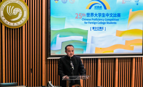 2026年4月19日,驻爱尔兰大使赵希源夫妇出席第二十五届“汉语桥”世界大学生中文比赛爱尔兰赛区比赛,来自爱各高校的16位选手参赛,都柏林大学副校长埃亨及参赛选手亲友近百人观看比赛。