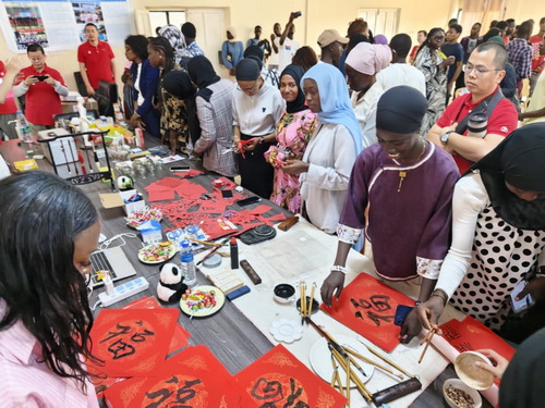 冈大孔子学院与中国援冈医疗队在现场展示中国书法、茶艺、剪纸和中医诊疗,冈师生踊跃参与互动,人文交流氛围友好热烈。