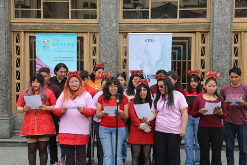 活动中圣安德烈斯大学汉语教师带领学生们唱中文歌、诵中国诗、跳中国舞,现场还设置了中国书法、剪纸、美食、茶艺等展台,吸引大学生、中文爱好者、各界友人等近1000人次参观体验。